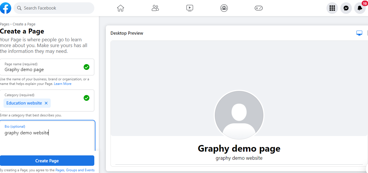 After clicking the “Create a facebook page” button, you will be redirected to the this page: