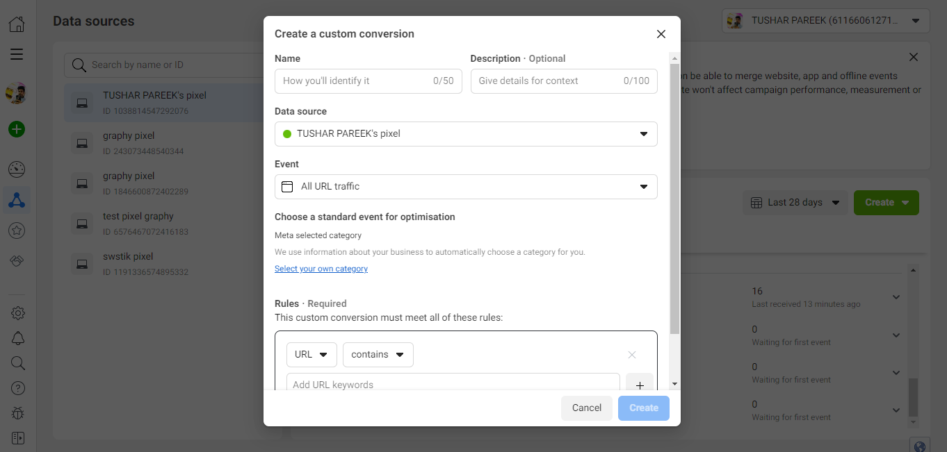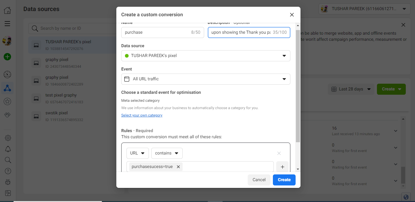 Upon clicking on the “Creating custom conversion” button, we are redirected to this pop-up page, we need to assign a rule for each conversion to be defined.